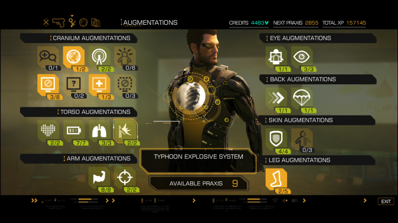Maga a választék is igencsak jó, számos passzív képesség van, több mint eddig, de sok az aktív is. A láthatatlanságot, a falon átlátást és a hackelést már említettem korábban, de a falakat be is zúzhatjuk, az inventoryt bővíthetjük, strapabíróbbá válhatunk. Vagy éppen ejtőernyőzhetünk a zuhanások során, gyorsabbak lehetünk, fegyverré válhatunk, és így tovább. Egyik kedvencem viszont a social enhancer (CASIE) lett, tetszik, ahogy nyomon kísérhetjük a vallatásnak alávetettek vagy vitapartnerek reakcióit, elemzést ad róluk, és ha ez nem elég, még megfelelő feromonok (vagy micsodák) bevetésével befolyásolhatjuk is őket a döntéshozatalban. Exkluzív eredményekre mondjuk ne számítsunk, az alapjátékban egy-egy mellékesnek tekinthető megjegyzést leszámítva egyetlen esetben szükséges a meggyőzéshez, és az sem eget verő fontosságú jelenet az adott mellékküldetés során sem, de ezt nem írnám a rovására, ettől még hasznos és érdekes segítség.