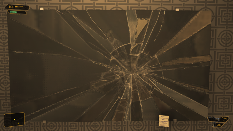 Az art design már sokkal inkább rendben van, a kiberrenszánszhoz megtalálták a múltat és a jövőt jól összehozó stílust. A kék-fekete színvilág helyett arany-feketére váltás már érdekesebb. Én jól viseltem, de azért sok tud lenni, aki meg a sárga keretekkel együtt játssza (ez az alapbeállítás!), az rosszul lesz tőle. A helyszínek némelyike egészen erős elképzeléseken nyugszik, és jól is fest, de még Hengsánál is azt éreztem, hogy ez így marha jó, de még pofozni kellene rajta. Nagyon tetszik viszont a különböző belső helyszínek berendezése, akár a különböző épületek logikus belső felépítésről van szó, akár karakterspecifikusabb dolgokról. Adam lakosztálya, Sarif vagy Pritchard irodája, és lehetne még sorolni, mind gazdagon berendezett, rengeteget mesélnek a karakterről. Ritkán látni ennyire igényes és aprólékos munkát. Ami eszembe jut még, az... Még gondolkodom.