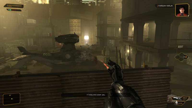 A Deus Ex mindig is inkább a sunnyogás felé húzott az FPS-lét mellett. Darálni, ha nem is a leghatékonyabban, de a leginkább modern módon most lehet. Legalábbis az elődökhöz képest ebben a leglátványosabb a fejlődés, ha a kor lövöldéi mellé aligha tehető. Szokás szerint megkapjuk az FPS-alapokat a spéci képességek extráival és a fegyvermodokkal, immár a kor szavának, de nem az ízlésemnek megfelelően fedezék használattal kiegészítve. Van repertoár ismét bőven, annak ellenére is, hogy az automatizált közelharc miatt se bikacsök, se fénykard. Sajnos pár átgondolatlan megoldás is született, ilyen például a zsebrakétavetővé váló, helyet alig foglaló revolver. Az igazi futurisztikus nehéztüzérséghez pedig a játék végén fizikai képtelenség magunkkal hurcolni az összes modot, így korlátozott, hogy mennyire tudjuk felfejleszteni őket. Cserébe megszívatták a fejlesztők az alappisztoly kedvelőit is: a játék második felében, írd és mondd, egyetlen tárat találtam hozzá. Mindehhez az AI hozza a minősítetten retardált szintet, bár kezdetben könnyen hullunk, a pukkantgatások után libasorban felvonuló zsémbes szomszédság gyakran megmosolyogtató. Szóval inkább ugorjunk is.