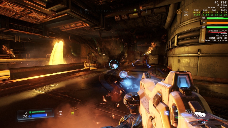 A DOOM az első Vulkan supporttal rendelkező AAA-kategóriás játék (a Talos Principle és a DOTA 2 is használja, de még csak bétában), és bár a teljesítmény szempontjából ennek ellenére kiforrott munkáról van szó, az új technológia implementálásának még egyértelműen akadnak kalapálásra váró gyermekbetegségei. Az id reméli, hogy további optimalizációval és jobb driverekkel egyre feljebb lehet majd tolni az fps-t, de az átlagjúzernek inkább az lehet fájó, hogy a képkockaidőzítés és ezzel együtt a vsync minősége bőven hagy maga után kívánnivalót. Példának okáért az én masinámon a CPU-intenzív pontokon 20-30 fps-el gyorsabb a játék, de az egérmozgás messze nem annyira sima, mint vsync-el megtámogatott OpenGL 4.5 esetén.