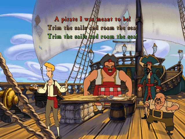 De hiába nyomom ki akár a saját szemeimet is, nehéz elmenni amellett, ahogy a CoMI zeng. Igen, első osztályú minőség volt a maga korában. Ma már persze megkaptuk az elődök speciális változataihoz is a hagyománytisztelő szinkront, de amikor először szegezett a játék a székbe, akkor legfeljebb csak epedezni lehetett egy beszélő Guybrush után. Szóval a hangszínészet a korát tekintve remek, megkockáztatom, még jobb is az előző részekénél, már csak azért is, mert gyárilag velük készült, és Dominic Armato ifjabb hangja is még jobban áll neki. Nemkülönben dicsérni tudom a zenét is, bár itt az első részt megidéző, és egyébként is szépen csengő dallamok már az alapelvárást képezték, ha nem MIDI-ről váltott az egyszeri kalandor.