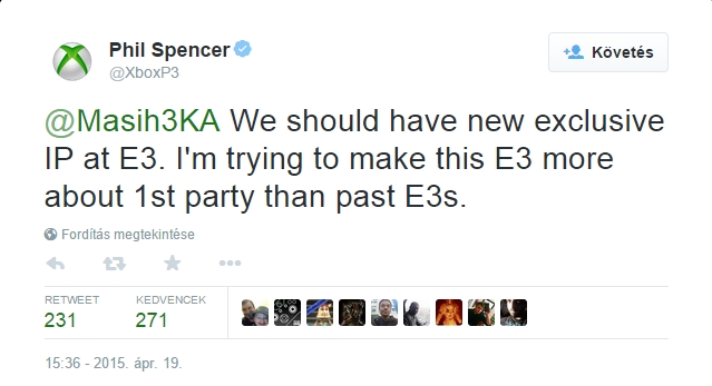 Phil Spencer, aki mondhatjuk, hogy az Xbox feje, azt csiripelte Twitteren, hogy új exkluzív IP-vel fog az E3-on izmolni a Microsoft. A konzolvezér hangoztatja: odateszi magát, hogy újra inkább a first-party exkluzívokról szóljon a Los Angeles-i show. Úgy látszik, hiába pörgetik a nagy multiplatform nevek az eladásokat, a masináknak mégsicsak nagy szükségük van a nekik egyedi arculatot adó exkluzívokra. Elvégre a PS4 éppen annak is köszönhette a helyzeti előnyét a startkor, hogy a PS3-at sikerült az exkluzívok otthonaként felépíteni a játékosközönség szemében.