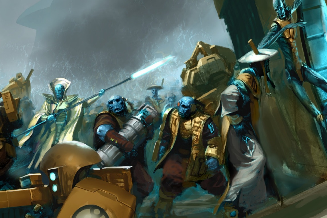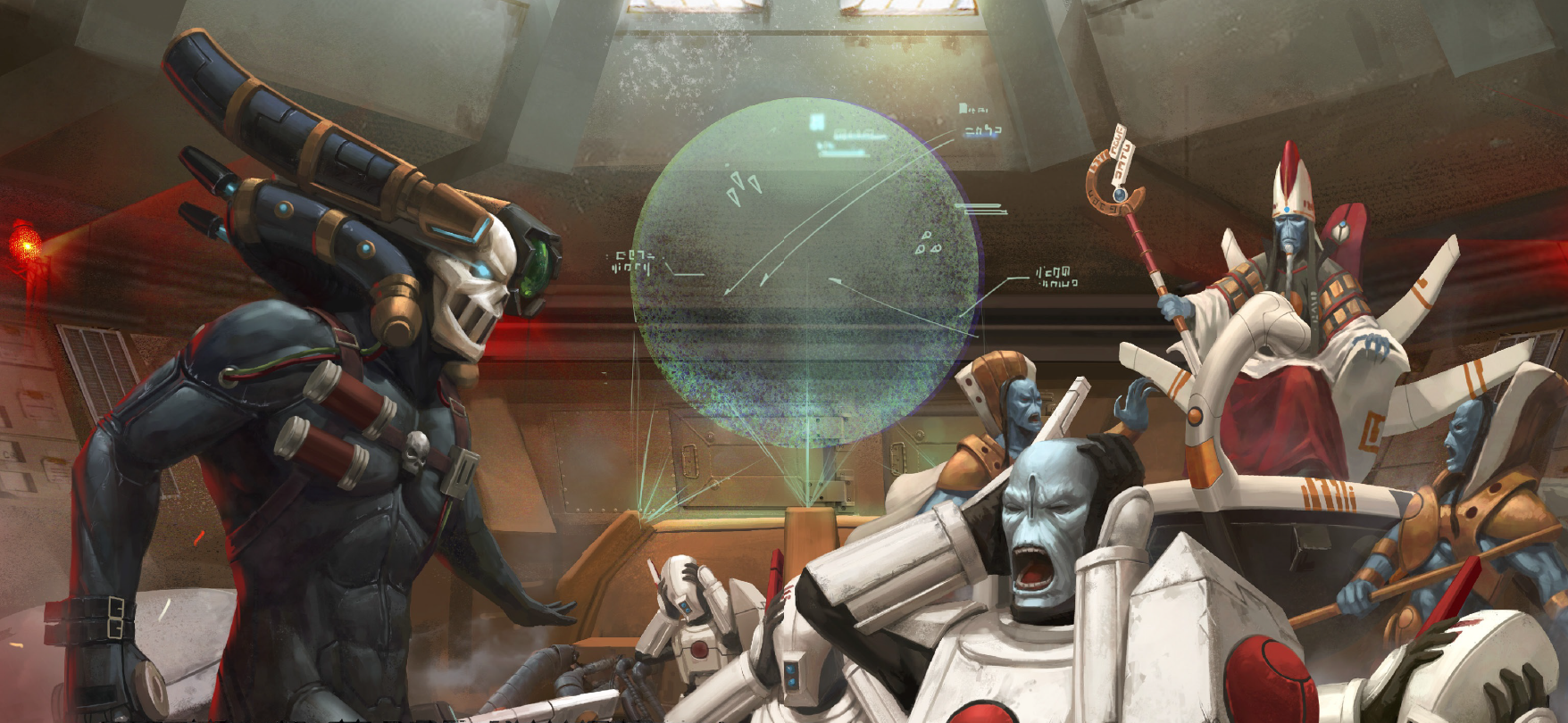 Balról jobbra egy Éteri, két Föld- egy Víz- és egy Légkaszt Tau, az előtérben egy Tűzkaszt katona páncélban.